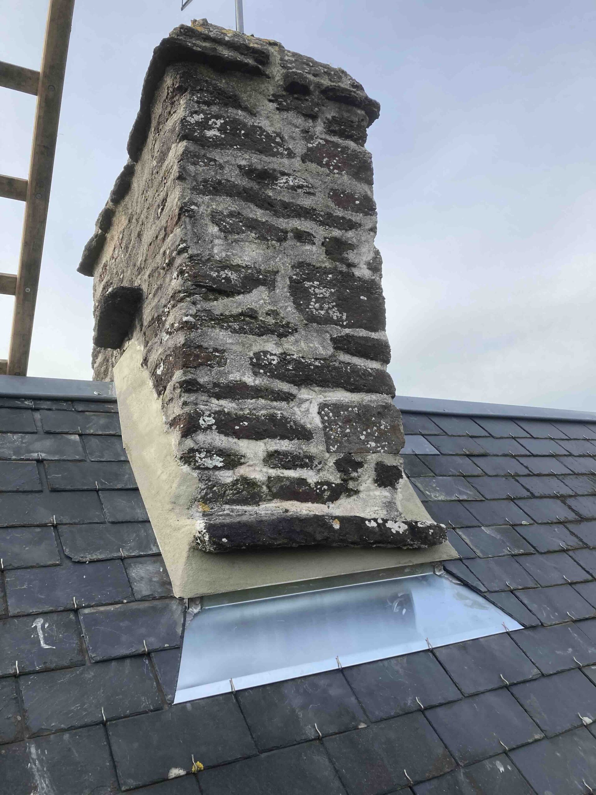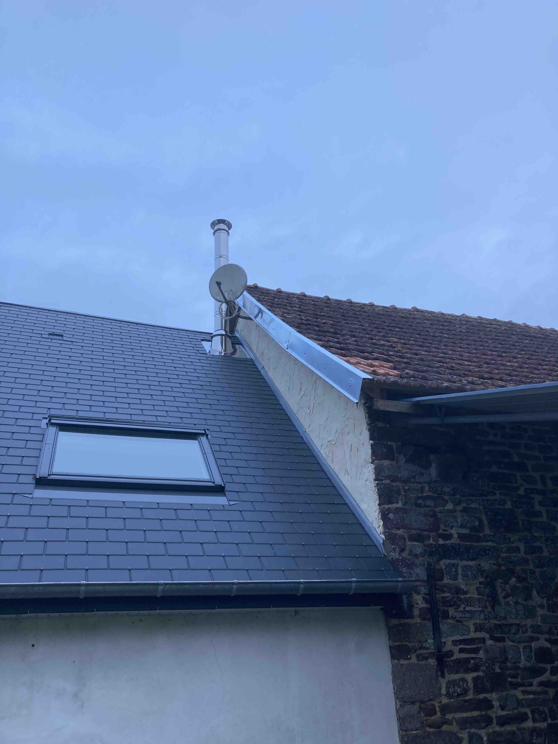 Dépose des anciens éléments de zinguerie et du solin. Façonnage de nouvelles bavettes en Zinc, reprise de la couverture et
