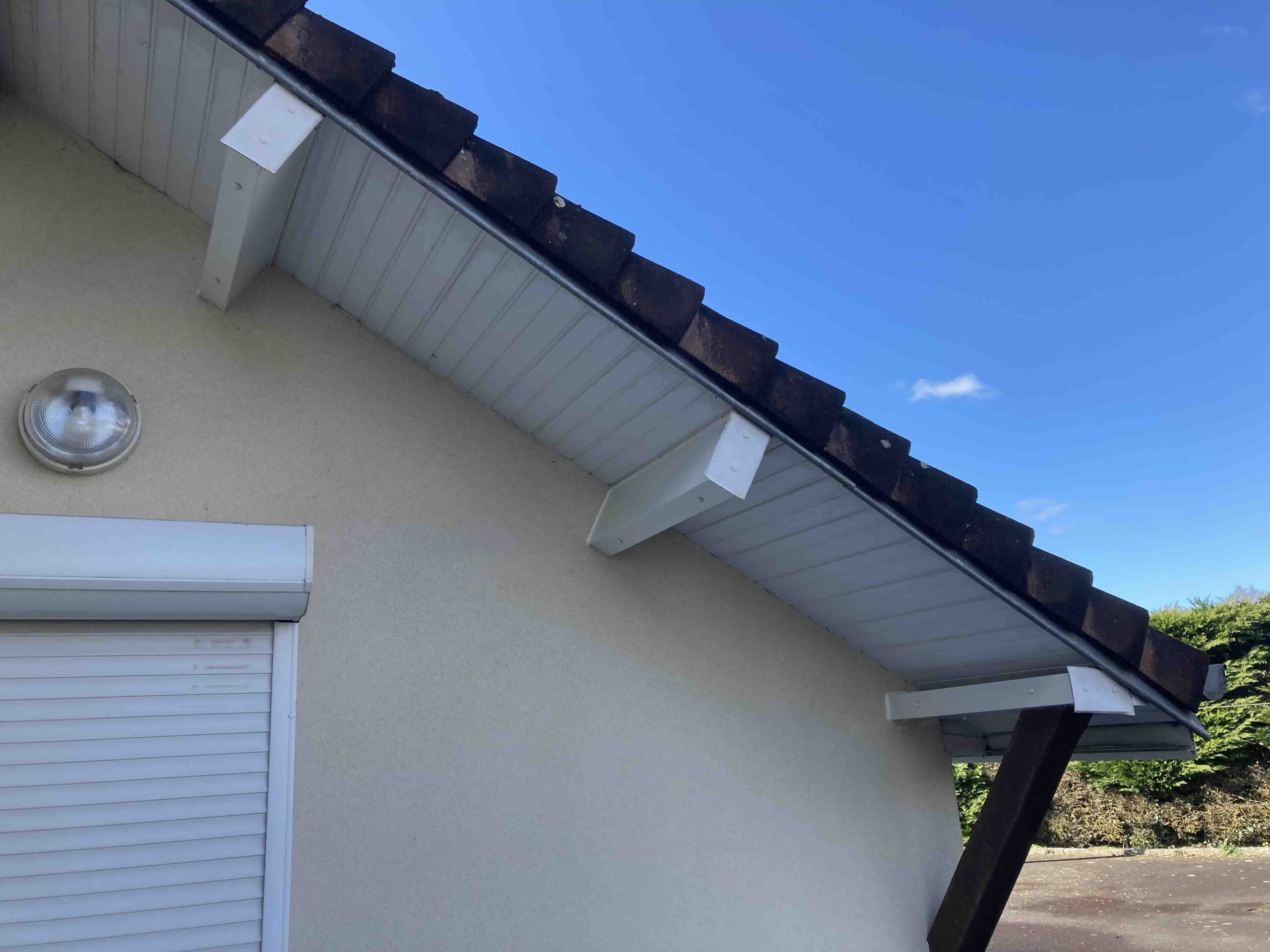 Pose d’habillages en tôle blanche pour des pannes débordantes.