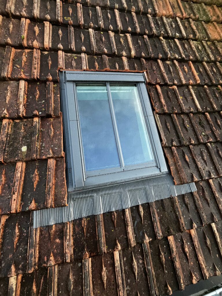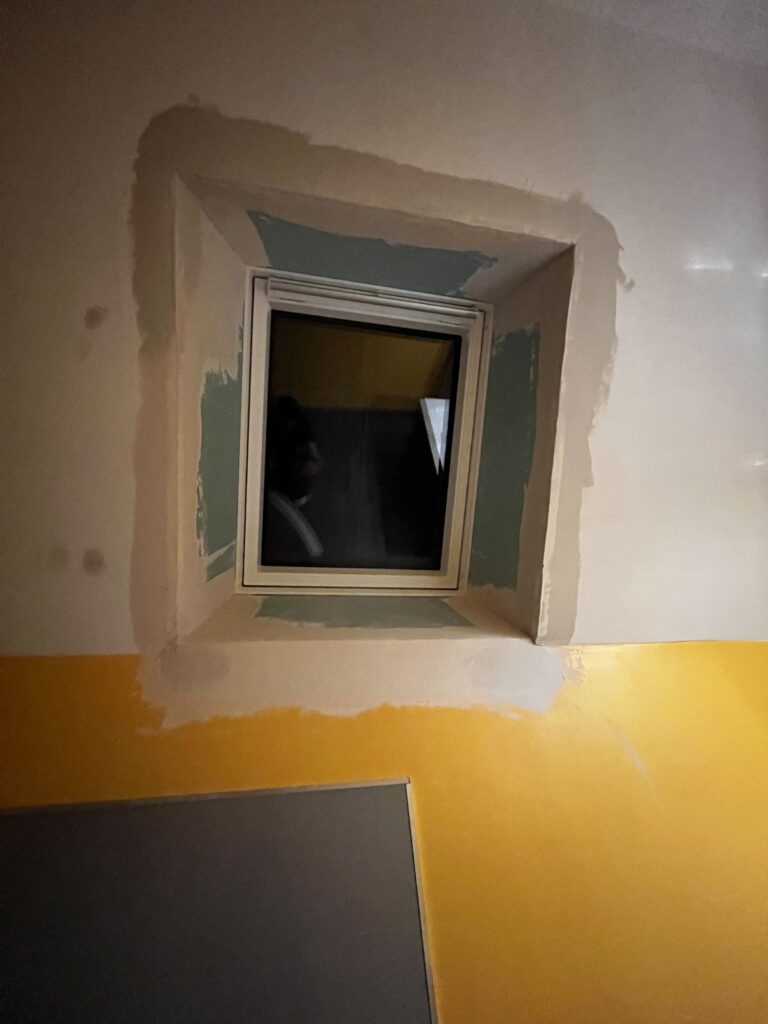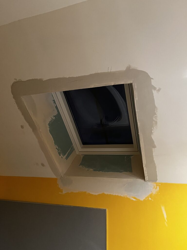 Création d’une ouverture dans une salle de bain avec la pose d’un Velux et son meneau sur une toiture tuile. Egalement la création des éveils en placo-plâtre ainsi que les bandes à joints.